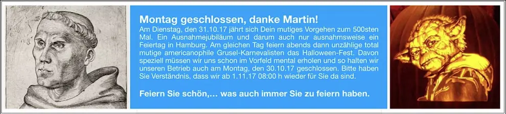 MONTAG VOR DEM REFORMATIONSTAG UND AM REFORMATIONSTAG SELBST HABEN WIR GESCHLOSSEN!