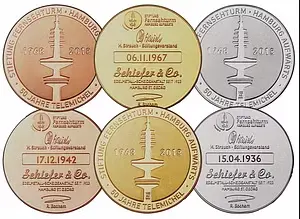 Am Mittwoch, den 11.10. präsentierte die “Stiftung Fernsehturm – Hamburg aufwärts” anläßlich der 5. Hamburger Stiftungstage ihr früheres Konzept für die Wiedereröffnung des Hamburger Fernsehturms und auch das neue Konzept, wie die fast-auszahlungsbereiten Millionen aus Hamburg teilweise wieder in die Sozialetats der Stadt zurückfließen könnten. Wir verkaufen Medaillen, die wir mit der Stiftung entwickelt haben und die Geld in die Kasse der kleinen, gemeinnützigen “Anstiftung” bringen sollen. Sie kosten, fortlaufend nummeriert, 50, 128 und 1.968 Euro, incl. MwSt. Gegen einen vertretbaren Aufpreis, kann man seine Medaille – statt mit einer fortlaufenden Nummer – auch mit einem Wunschdatum erhalten. Allerdings wird jedes Datum nur einmal verwendet, je Metall und das macht auch Sinn…