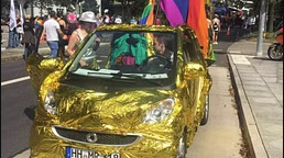 Für Euch wird es güldene Bonbons regnen, aus nem rollenden, goldenen Smart, aus Händen, die sonst fein vergolden… Ein paar wenigstens, alle Meter und aber jeder – auch ohne Bonbon – kann mitmachen… und versuchen, Gold zu gewinnen…