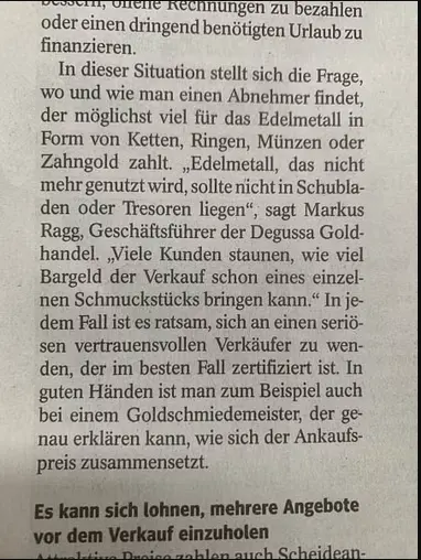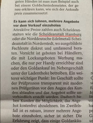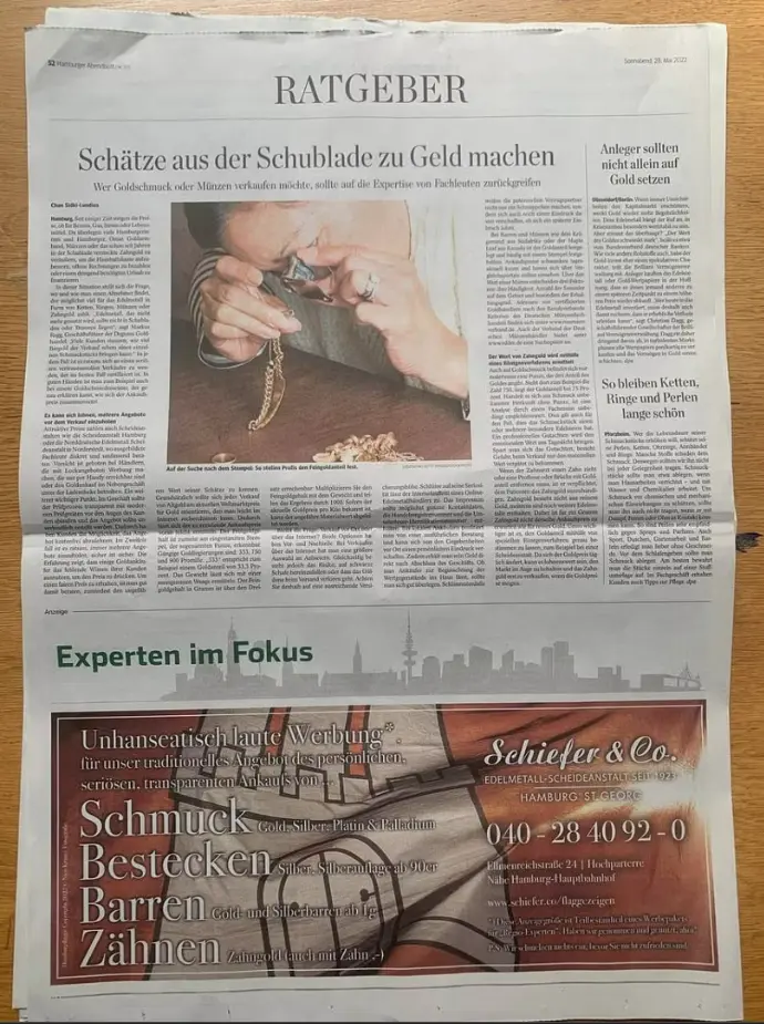 Bis vor wenigen Jahren, waren wir die Einzigen, die auch Privatkunden die gewerbliche Ausarbeitung von Edelmetallen anboten und doch werden wir im Artikel des Hamburger Abendblatts vom 28.5.22 namentlich nicht genannt. Das hat uns überrascht und wir werden das hinterfragen, wo wir doch als “RegioExperte” des Hamburger Abendblatts redaktionell präsentiert werden sollten. Haben wir ggf. nicht die richtigen Zahlungswege gewählt?? Die für “RegioExperten” vorgesehene, protzige Anzeige macht das vielleicht ein wenig wett ,-)