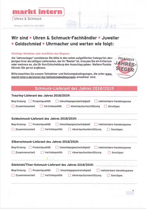 Um möglichst viele Teilnehmer zu erreichen, dürfen Sie die Beilage gerne an Kollegen weitergeben. Zusätzlich haben wir auf unserer Homepage eine Onlineumfrage eingerichtet. Den Link dazu finden Sie auf www.markt-intern.de/schmuck. Dort steht die Beilage auch als pdf-Datei zum Herunterladen und Ausdrucken bereit. Bitte beachten Sie bei Ihrer Bewertung unsere Teilnahmebedingungen (www.markt-intern.de/uhren-lsp-teilnahmebedingungen). Die wichtigsten Regeln: Die Umfrage richtet sich an Fachhändler und Fachhandwerker der Uhren & Schmuck-Branche Jedes Unternehmen darf pro Umfrage nur einmal teilnehmen Nominieren Sie nur Unternehmen, mit denen Sie 2018 und/oder 2019 zusammengearbeitet haben Teilnehmern ist es nicht gestattet, sich von den zu bewertenden Unternehmen oder Dritten im Zusammenhang mit der Bewertung Vorteile gewähren oder versprechen zu lassen Um Manipulationsversuchen vorzubeugen, werden nur Bögen in die Auswertung einbezogen, bei denen das Absenderfeld ausgefüllt/gestempelt ist. ‘markt intern’ sichert allen Teilnehmern Informantenschutz zu, d. h. jeder Teilnehmer kann sich darauf verlassen, dass seine Bewertung ohne seine Zustimmung weder dem zu bewertenden Unternehmen noch sonstigen Personen oder Unternehmen namentlich bekannt gemacht wird.