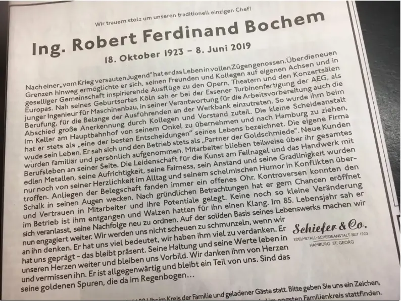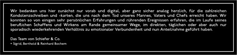 …haben wir alle was nachgerufen. Alle Mitarbeiter, die ein paar Worte finden wollten, konnten dies tun. Ein Blatt lag aus und nach ein paar Tagen Sammlung gab es Erinnerungen und anteilnehmende Worte zur Auswahl. Jeder sollte sich vertreten fühlen. So entstand diese Traueranzeige… Wir erinnern uns mit Wehmut, aber an viele sehr fröhliche gemeinsame Ereignisse.