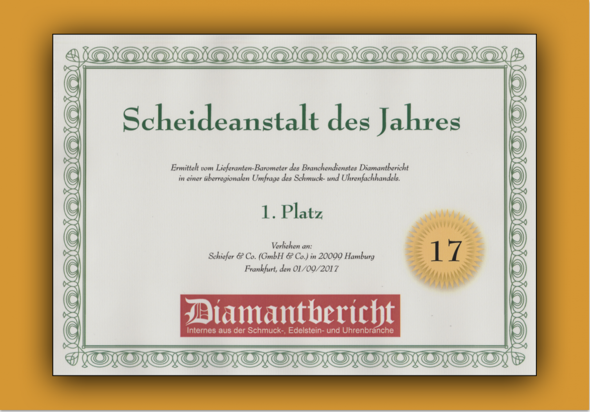 Nun durften wir uns schon im vorvorletzten, im vorletzten und im letzten Jahr, gemäß den Umfragen des Branchendienstes “Diamantbericht” unter Abonnenten “Scheideanstalt des Jahres” nennen, aber es bleibt kurios, angesichts der geballten Kompetenz der Mit-Mitglieder in den Fachverbänden. Mit gutem Grund arbeiten wir Nordlichter in vielen Bereichen partnerschaftlich nur mit seriösen Scheideanstalten, südlich der Elbe in Pforzheim und Hanau. Unter den teilweise sehr spezialisierten, vertrauensvoll arbeitenden Edelmetall-Recycling-Betrieben Deutschlands, sind wir mit hoher Wahrscheinlichkeit das kleinste Licht. Aber dafür sind wir die einzige älteste traditionelle Edelmetall-Scheideanstalt nördlich der Elbe bei Hamburg mit vielfältigem Dienstleistungsspektrum für Goldschmiedeateliers.