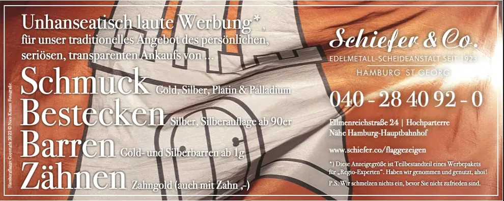 Bis vor wenigen Jahren, waren wir die Einzigen, die auch Privatkunden die gewerbliche Ausarbeitung von Edelmetallen anboten und doch werden wir im Artikel des Hamburger Abendblatts vom 28.5.22 namentlich nicht genannt. Das hat uns überrascht und wir werden das hinterfragen, wo wir doch als “RegioExperte” des Hamburger Abendblatts redaktionell präsentiert werden sollten. Haben wir ggf. nicht die richtigen Zahlungswege gewählt?? Die für “RegioExperten” vorgesehene, protzige Anzeige macht das vielleicht ein wenig wett ,-)
