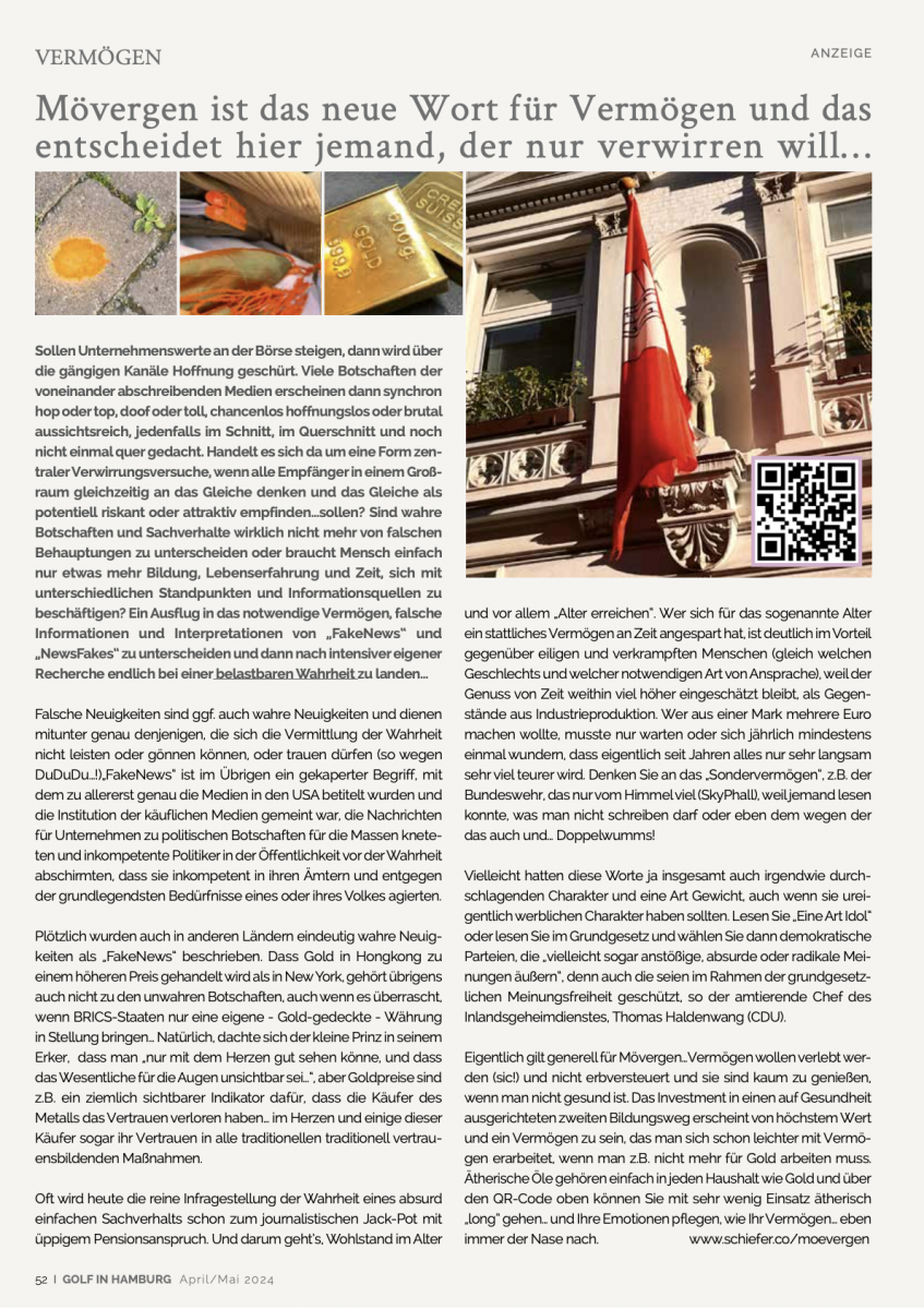 Mövergen ist eine Wortkreation, komponiert aus den Silben Ver-mö-gen, nur eben durchgewürfelt, wie so vieles im Moment. Lesen Sie gern noch diese wenigen zusätzlichen Zeilen, die den Artikel in der “GOLF IN HAMBURG” Ausgabe Vermögen April 2024 ergänzen. Was noch nicht geschrieben ist allerdings, können Sie auch noch nicht lesen, aber schreiben! Wenn näHmlich keiner schreibt, kann keiner lesen und DAS ist tatsächlich dämlich! Danke für Ihr Verständnis.