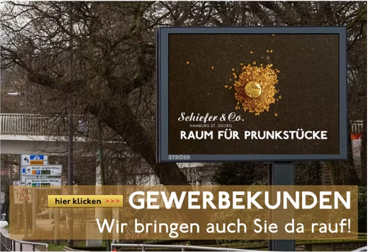 Wir haben uns was ausgedacht. Es wäre doch gelacht; wenn wir zusammen nicht für eine größere öffentliche Prominenz Ihrer Prunkstücke sorgen könnten. Große Werbeflächen allerdings müssen über einen längeren Zeitraum gebucht werden, um finanziell erträglich und für den Mittelstand preiswerter zu werden. Wir haben für Sie für die nächsten Jahre mit gebucht: 3 RoadSide Screens im Grindelviertel und InfoScreens in 3 Hamburger Bahnhöfen.