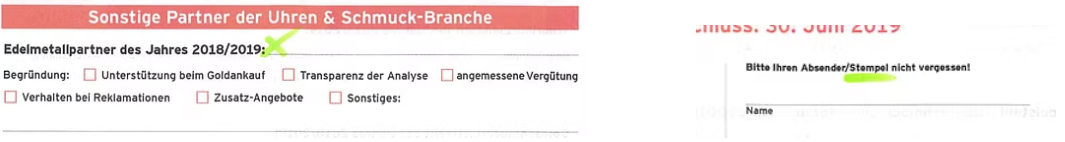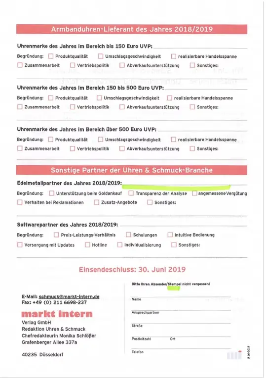 (Zitat)”Ebenso wollen wir wissen, wer die beliebtesten Partner für Edelmetalle und Software/Warenwirtschaft sind. Auf dem beiliegenden Umfragebogen nennen wir für jeden Bereich auch verschiedene Kriterien zum Ankreuzen. Mit Ihrem Häkchen können Sie uns mitteilen, warum Sie einen bestimmten Partner als Jahressieger nominieren.