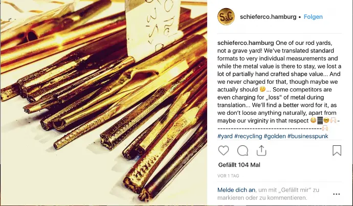 Bevor aber “Verarbeitungsreste” aufzuarbeiten sind, muss es erstmal eine fruchtbare und nachhaltig erfolgreiche Wertschöpfung gegeben haben. Die Rohstoffe und Rohmaterial, Halbzeuge aus Edelmetallen und maßgeschneiderte Sonderanfertigungen für die Schmuckherstellung sind der eigentliche Schmierstoff unserer Wertschöpfungskette an deren Anfang und Ende die Inspiration und das handwerkliche Geschick der KünstlerInnen und Künstler an den Werkbrettern stehen…