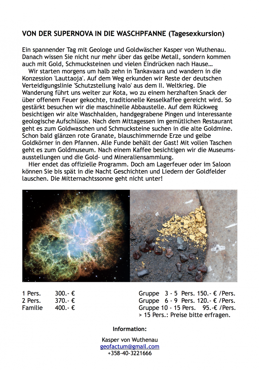 Die Besucher können nach Gold und edlen Steinen prospektieren, Kultur und Geschichte der Goldfelder im Goldmuseum entdecken, lappländische Spezialitäten im Restaurant Wanha Waskoolimies (“Zum alten Goldgräber”) genießen und in urigen Holzhütten mit offenem Kamin übernachten. Der deutsche Geologe Kasper von Wuthenau steht Ihnen rund um’s Gold gerne zur Seite.