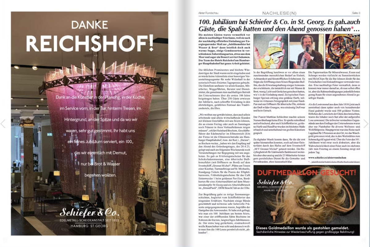 Unser 100. Jubiläum war eine sehr heimelige Veranstaltung und für viele Goldschmiede und Angehörige der Gold- und Silberschmiedezunft. Das 95. durften wir noch mit unserem Senior und seiner Frau feiern und wir wurden schon damals mit Blumen und teilweise sehr inspirierten und inspirierenden Präsenten bedacht. Wir sind der Tradition verbunden geblieben und haben im Hamburger Hotel Reichshof gefeiert, am Abend des 28.4.23. Der in Holz getäfelte Saal des Hotels war eine prächtige Bühne und es gab Musik, Wasser, Brot und dann auch noch kleine Leckereien. An den folgenden Tagen des Wochenendes gab es noch Veranstaltungen für diejenigen unserer Kunden, die am Freitag und auch am Samstag noch in ihren Geschäften Präsenz zeigen mussten. Wir erinnern uns gern an den Abend, die Rundfahrten auf Alster und Elbe und Begehungen einiger Attraktionen unserer stolzen Hansestadt.