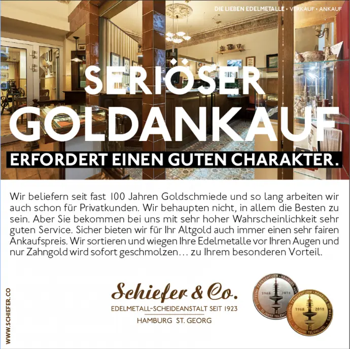 Fragen Sie gern in einer Goldschmiede in Ihrer Nähe. Fragen Sie Freunde, Nachbarn, Arbeitskollegen oder flüchtige Bekannte nach ihren Erfahrungen mit “Schiefer & Co., der Scheideanstalt am Hamburger Hauptbahnhof”. Vielleicht hat ja jemand mit uns gute Erfahrungen gesammelt, Gutes über uns gehört, uns selbst schon mehrfach empfohlen. Oder Sie bekommen eine andere, für Sie bessere Empfehlung. Auch das freut uns dann in Ihrem Interesse, denn wir können nicht in jedem Fall behilflich sein.