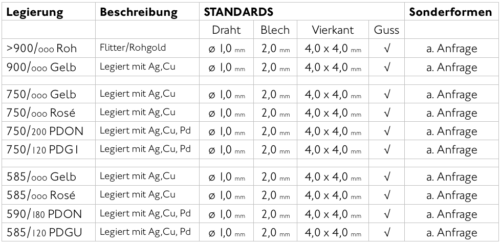 Seit etwa 3 Jahren produzieren wir direkt aus dem sauberen Rohgold durch sauberes “Runterlegieren” mit Silber aus Bruchankauf und Kupfer aus Kabelschrott-Recycling die folgenden Schmucklegierungen: