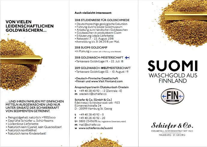 Mit diesen Feingehalten (ohne störende Beimetalle) ist SUOMI Waschgold eine hochfeine Naturlegierung, die sich sofort verarbeiten lässt. Insgesamt werden in Lappland während der Saison (von Juni bis Ende September) offiziell zwischen 25 kg und 40 kg Rohgold Flitter und Nuggets nur mit Wasser unter Einsatz der Schwerkraft ausgewaschen.