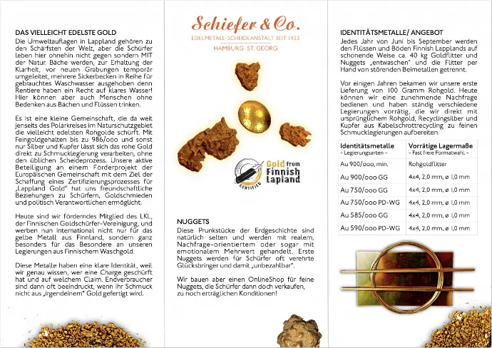 Mit unserem feinen SUOMI Waschgold können wir einen noch höher aufgehängten Anspruch bedienen. Es ist das vermutlich sauberste, nachhaltigste und vielleicht darum auch das edelste Gold, das es zur Schmuckfertigung am Markt gibt!